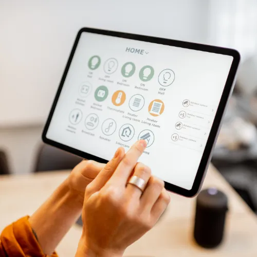 We can integrate a variety of devices into your home automation system, including smart lighting, thermostats, security cameras, smart locks, doorbells, speakers, and home theaters.